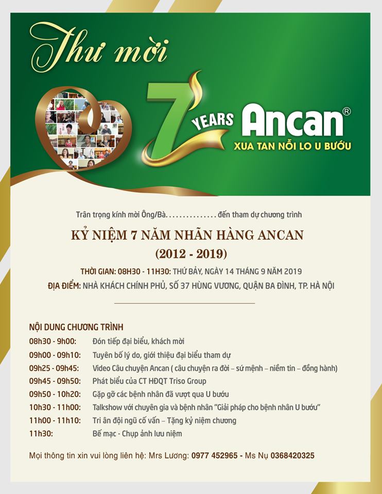 Nhân kỷ niệm 7 năm ra đời. nhằm lan tỏa hơn nữa niềm tin, nghị lực cho các khách hàng mắc các bệnh liên quan đến u bướu, ung thư, mong muốn giúp họ vững bền ý chí chiến đấu, chiến thắng bệnh tật, Triso Group tổ chức sự kiện : “7 năm Ancan lan tỏa những câu chuyện thực chiến thắng u bướu”. Sự kiện được tổ chức long trọng vào 8h30 ngày 14 tháng 09 năm 2019 tại nhà khách Chính Phủ số 37 Hùng Vương, Ba Đình, Hà Nội.
