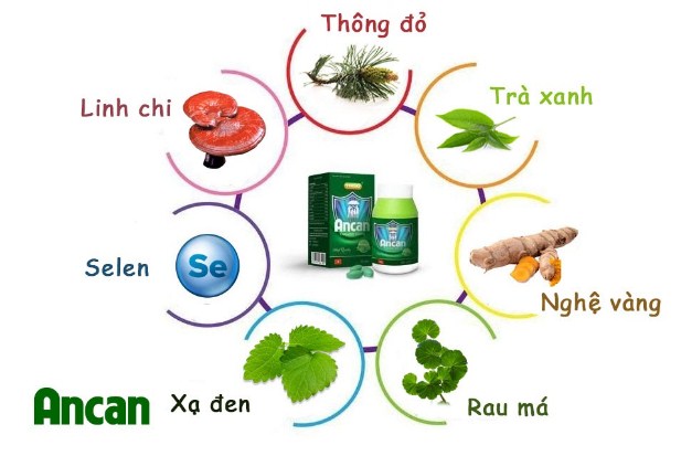 Sản phẩm Ancan được bào chế từ các thảo dược quý được trồng tại Việt Nam như Curcumin từ củ nghệ, cao trà xanh, cao rau má, thông đỏ, xạ đen, linh chi,… cùng các nguyên tố vi lượng khác. Cụ thể, trong mỗi viên Ancan chứa: