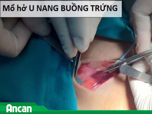 Bệnh nhân được gây mê toàn thân trước khi bắt đầu tiến hành phẫu thuật. Bác sĩ sẽ rạch một vết rạch lớn ở ổ bụng để tiếp cận với buồng trứng và khối u nang.